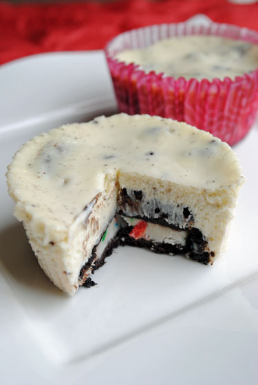 They turned out so well. The only downside is they are so small, you’ll want to eat three of them, and that is perfectly acceptable. 🙂 I’m usually apprehensive with cheesecake because it’s hard to tell when they’re ready to come out of the oven. I was nervous that these were undercooked, since you take them out while the middles are still jiggly. After cooling completely and letting the refrigerator work it’s magic, they were perfect! The texture of the cheesecake is so creamy and I liked the bursts of Oreo chunks throughout. The sour cream adds just a bit of tang that I think is needed to balance the sweet. You can really smell the tangy sour cream, but the flavor isn’t as strong, so don’t get worried! Using a whole Oreo as the crust is genius and makes it so easy. In the picture above, you’ll see I used the new Birthday Cake Oreos as the crust. They really do taste like cake and frosting, but they are really rich. I also made some with original Oreos as the crust, and I liked those better. The single-serving size makes these great for any special occasion, even if that occasion is just “I want some cheesecake!”