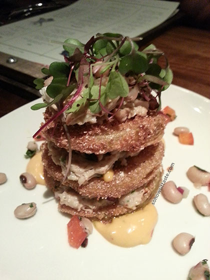 The Fried Green Tomato was delicious. Crab, field peas, feta, and smoked pepper aioli. I didn’t read the description so it was a nice surprise to have the crab. Even though it’s fried and looks heavy, this dish was light. Full of flavor and varying textures, and a great size to share.