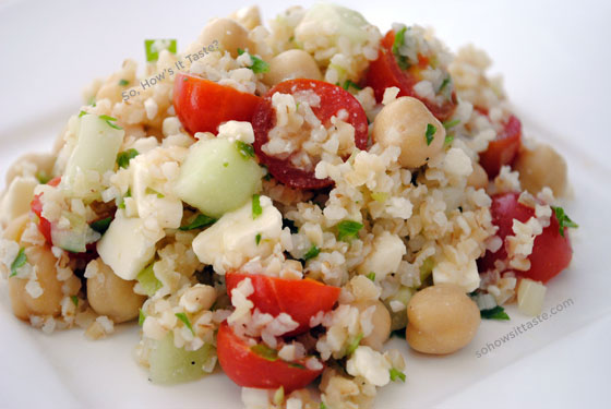 The freshness of this salad is amazing. Some of you could probably make it with foods right from your garden. This is a great recipe to make from your bounty at the farmers’ market, too. The dressing is simply lemon juice and olive oil and beautifully compliments the cucumber, tomatoes, and green onions. The onions also give a subtle kick. Definitely be sure to use fresh lemon and fresh parsley. The bulgur serves as a nice vehicle for all these veggies and adds a bit of nuttiness. The garbanzo beans round out the dish to make it more substantial. You’ll love the feta as well. I’m a sucker for almost any kind of cheese and this one is among my favorites. It’s salty and tangy and goes so well with the rest of the ingredients. The perfect addition to your meal planning now that summer is officially here!